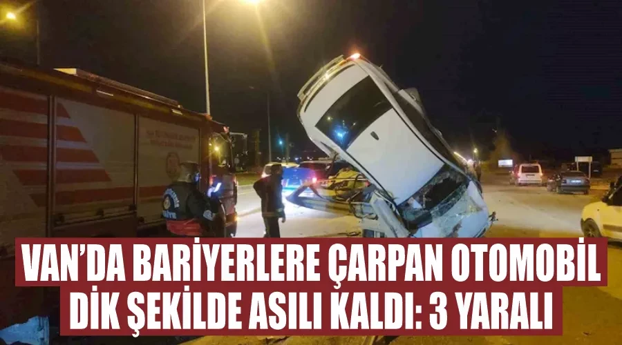 Van-Erciş karayolunda bariyerlere çarpan otomobil dik şekilde asılı kaldı. Kazada 3 kişi yaralandı.