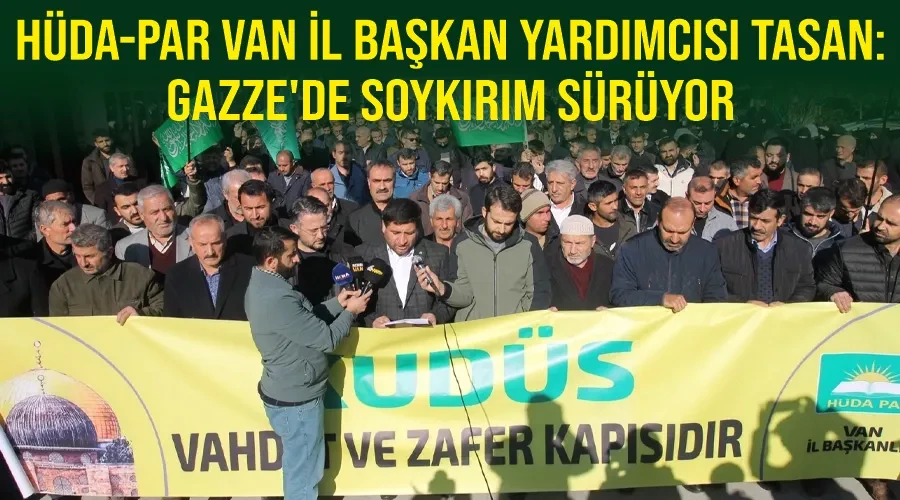Bu kapsamda Hz. Ömer Camii avlusunda bir araya gelen Hüda-Par Van İl Başkanlığı, Siyonist İsrail devletini sert bir dille kınadı. Basın açıklamasını okuyan Hüda-Par Van İl Başkan Yardımcısı Faruk Tasan, Gazze'de 7 Ekim'den bu yana vahşetin devam ettiğini vurguladı.