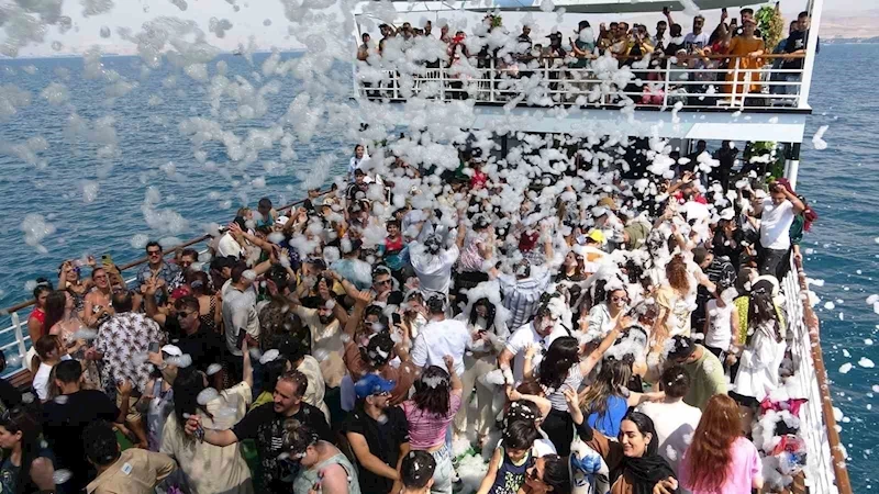 Okulların tatil olması nedeniyle Van'a gelen İranlı turistler, tekne ile açıldıkları Van Gölü'nde köpük partisi yaparak eğleniyor.