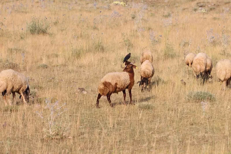 Van'ın Muradiye ilçesinde arazide otlayan küçükbaş hayvanların üzerine konarak beslenen kuşların beslenme anı kameraya yansıdı.