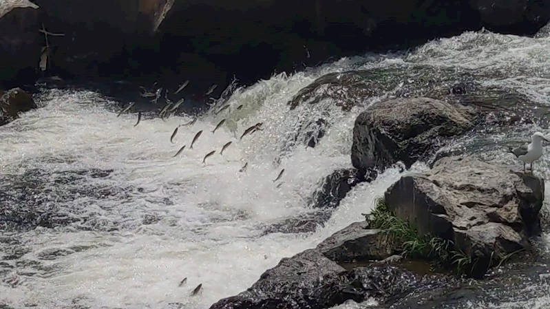 Önüne çıkan engelleri adeta uçarcasına aşan inci kefali, izleyenlere görsel şölen, dere kenarlarına akın eden martılara ise ziyafet sunuyor.