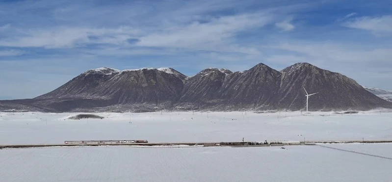 Trenin geçişi sırasında alınan görüntüler, Kirkor Dağı'nın görkemi eşliğinde karla kaplı düzlüklerden geçen trenin huzur dolu yolculuğu gözler önüne seriliyor.