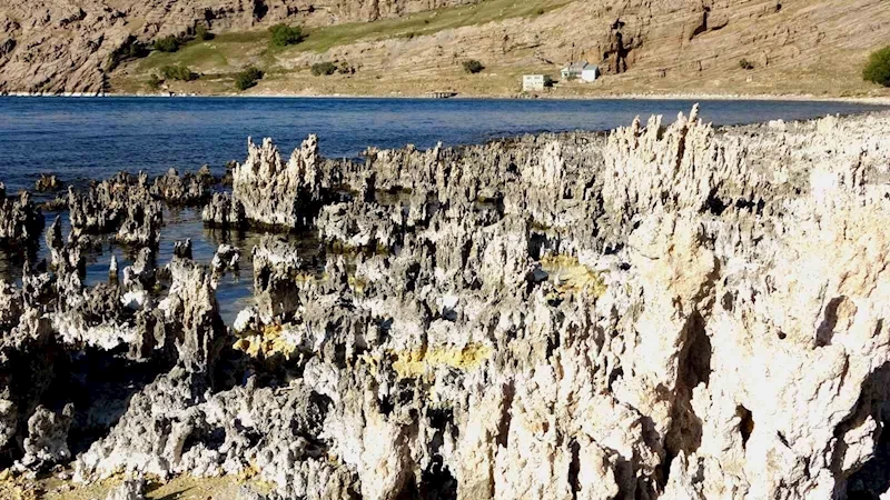 Türkiye'nin tek sodalı gölü olma özelliğini taşıyan Van Gölü'nde, son yıllarda sularının çekilmesiyle sahiller mikrobiyalit tarlasına döndü.