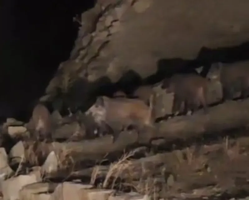 Başkale ilçesine 50 kilometre uzaklıkta bulunan İran sınırındaki kırsal Esenyamaç Mahallesi'ne akşam saatlerinde yaban domuzu sürüsü indi. Mahallede ikamet eden Mustafa Özdemir, yolun kenarında yiyecek arayan sürüyü cep telefonu kamerasıyla görüntüledi. Yaklaşık 10 domuzun bulunduğu sürü, yolun karşısına geçtikten sonra gözden kayboldu.