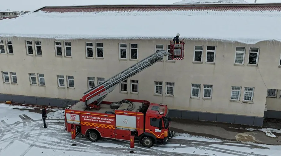 Van'da geçtiğimiz hafta etkili olan yoğun kar yağışının ardından eğitime verilen ara, Van Büyükşehir Belediyesi için önleyici çalışmalar için bir fırsata dönüştü. İtfaiye Daire Başkanlığı ekipleri, 5 Ocak Pazartesi günü yeniden başlaması planlanan eğitim-öğretim dönemi öncesinde, okul çatılarında ve bina girişlerinde oluşan ve 1 metreye kadar uzanan tehlikeli buz sarkıtlarını temizlemek için seferber oldu.