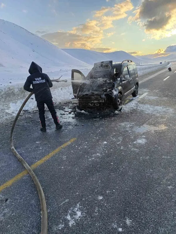 Van'ın Çaldıran ilçesinde seyir halindeyken yanmaya başlayan kapalı kasa kamyonet, itfaiye ekipleri tarafından söndürüldü.