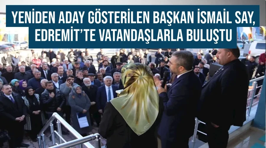 AK Parti'den yeniden aday gösterilen Edremit Belediye Başkanı İsmail Say, AK Parti Genel Başkan Yardımcısı ve Yerel Yönetimler Başkanı Yusuf Ziya Yılmaz'ın katılımıyla, aday tanıtım toplantısında yeniden Edremit Belediye Başkan Adayı olarak gösterildi. Tanıtım toplantısı sonrası konvoy eşliğinde AK Parti Edremit İlçe Teşkilatına gelen Başkan Say, burada vatandaşlara ve partililere seslendi. Kendilerini sabahın ilk saatlerinden itibaren yalnız bırakmayan herkese teşekkür ederek sözlerine başlayan Başkan Say, Cumhurbaşkanımız Recep Tayyip Erdoğan'ın tensipleriyle Edremit Belediye Başkan Adayı olarak yeniden görevlendirildiğini. Bu yolda Allah'ın kendilerini mahcup etmemesi dileğinde bulundu.
